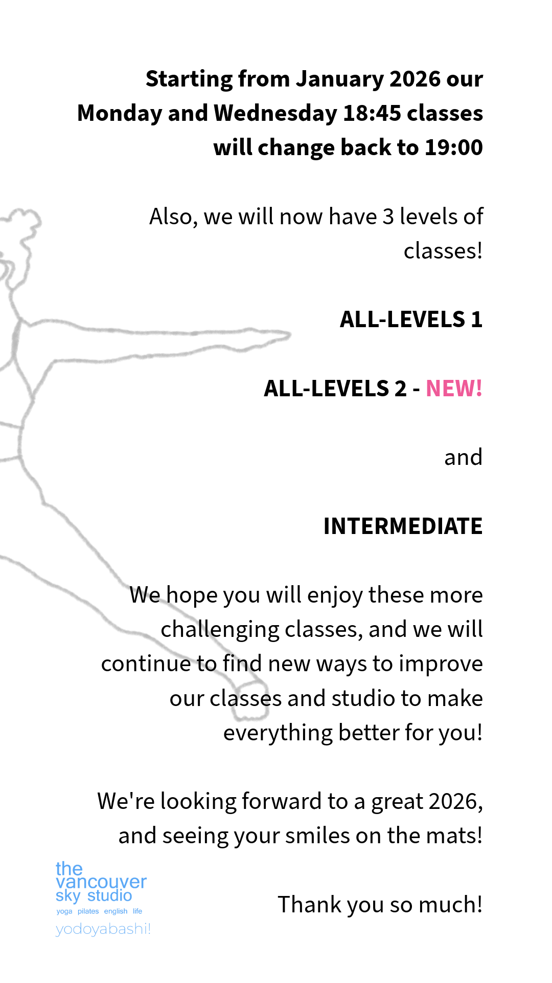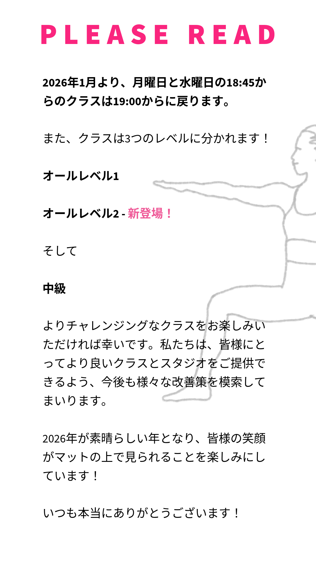 クラスが始まる約15分前にスタジオへお越しください